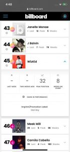 Wizkid ranks no. 45 on the list and tops popular American rapper, Meek Mill and singer, Camila Cabello.