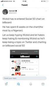 Let us keep hyping Wizkid and let haters keep hating & mentioning Wizkid so he’ll keep being a topic on Twitter and charting on billboard social 50