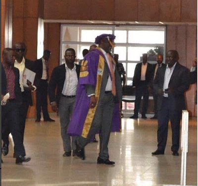 The controversial senator, representing Kogi West Senatorial District, and Chairman, Senate Committee on Federal Capital Territory (FCT) appeared at the arrived the Upper Legislative Chamber wearing an academic gown.