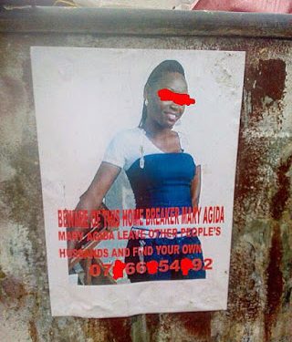 “Beware of this home breaker Mary Agida. Mary Agida please leave other people’s husbands and find your own”.