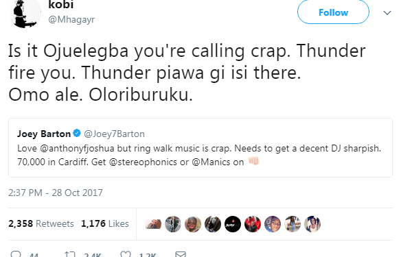Joey took to his Twitter Page to say the Ring walk music, Ojuelegba, by Wizkid is crap, and further advised the boxer to use a better music next time.