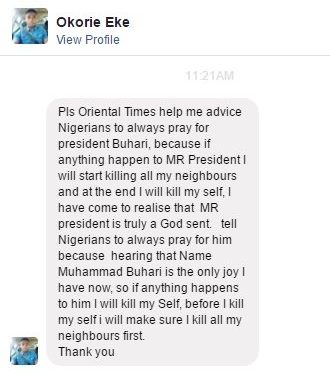 Pls help me advice Nigerians to always pray for president Buhari, because if anything happen to MR President I will start killing all my neighbours and at the end I will kill my self, I have come to realise that MR president is truly a God sent. tell Nigerians to always pray for him because hearing that Name Muhammad Buhari is the only joy I have now, so if anything happens to him I will kill my Self, before I kill my self i will make sure I kill all my neighbours first.