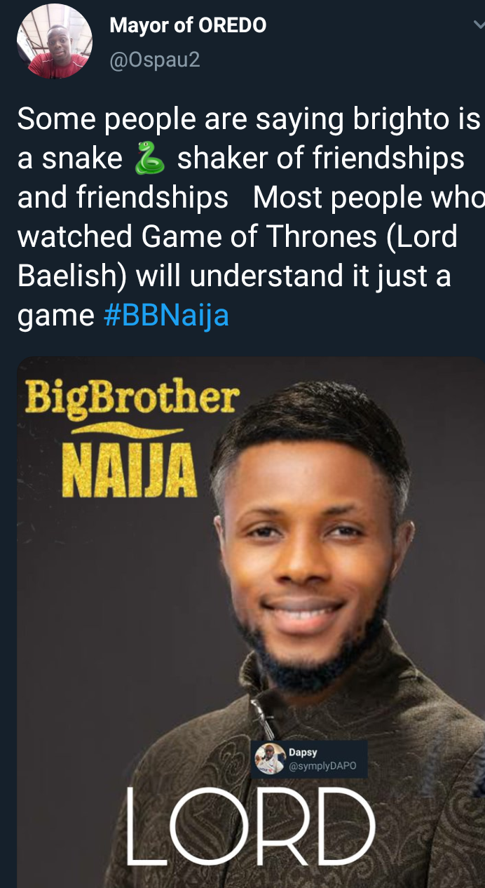 Some nicknamed him The professor, Lord Baelish or little finger because many thinks he came to the house well prepared with strategies to confuse his other housemate and leave him as the forerunner and he his also well known to always give advice, gossip and knows everything that goes on in the house.