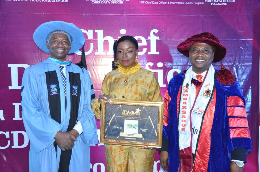 Recently, the Serial Entrepreneur, Cobbler, Multi-Media Expert, Brand/Event Expert, and PR consultant also, bagged an International Award and Regcognition for Excellence in Data and Information Management 2022 by the Institute of Information Management Africa presented byDr Oyedokun A. Oyewole, President Institute of Information Management Africa for her enormous contribution and using her unique media talk- shop called Bodex Social Media Hangout that is designed to create consistent awareness and engagement on the need for social media good and while curating practical solutions through the engagement of professionals making positive impact across platforms. During the presentation, Bodex Social Media Hangout was awarded Best Digital Program of the Year 2022