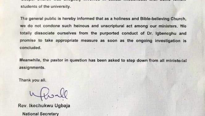 According to a press release by the church, while frowning at such crime, Dr. Boniface Igbeneghu has been sacked as a minister.