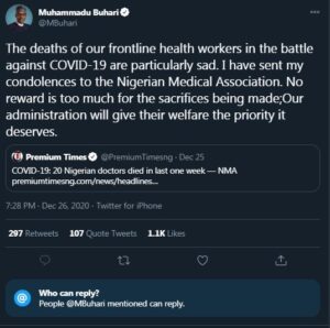 The deaths of our frontline health workers in the battle against COVID-19 are particularly sad. I have sent my condolences to the Nigerian Medical Association. No reward is too much for the sacrifices being made;Our administration will give their welfare the priority it deserves.