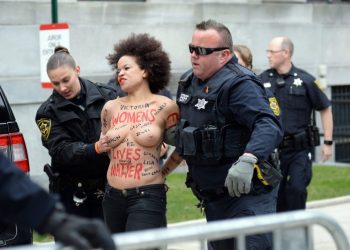 A topless woman with the phrase "Women's Lives Matter" written in red ink across the front her body was arrested...