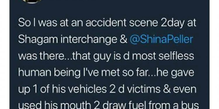 With this singular act, Shina Peller indeed restore faiths that there is hope for humanity after all, as we pray for the victims of the fatal accident for survival.