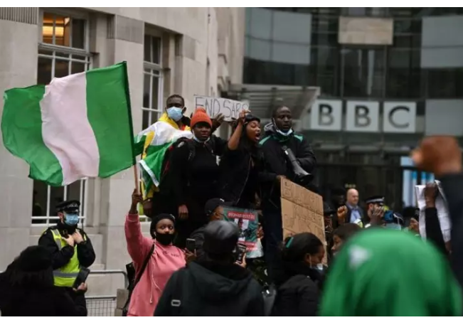Others waved Nigerian flags, with some splashed with red paint to make them look bloodstained, while some wore green and white masks and shouted through loudspeakers as they protested at London landmarks, including Parliament Square and the BBC.