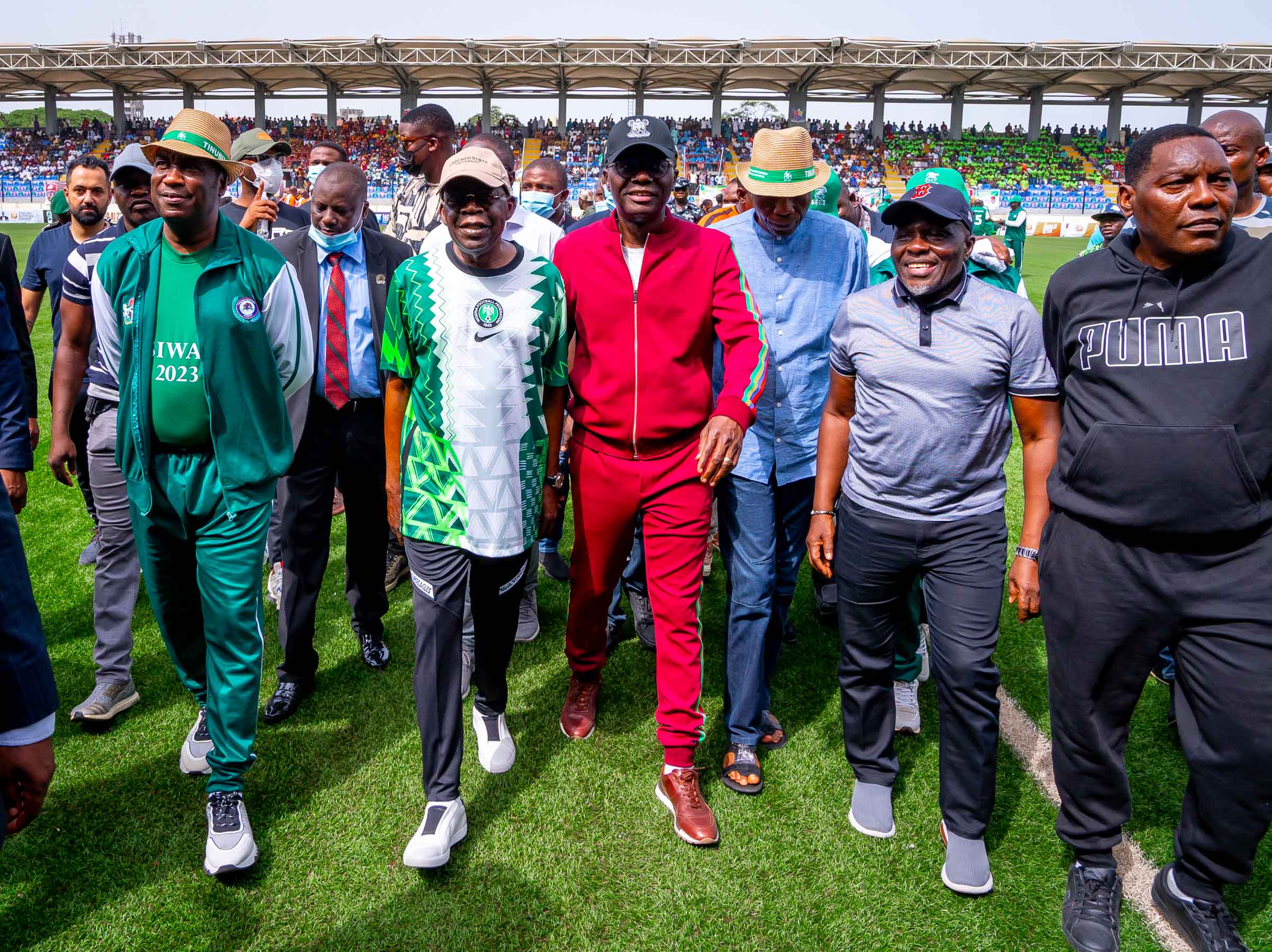 Lagos State Governor, Mr. Babajide Sanwo-Olu; his deputy, Dr. Obafemi Hamzat; Minister of Youth and Sports, Mr. Sunday Dare; Nigerian Ambassador to Spain, Demola Seriki; Speaker of the Lagos State House of Assembly, Rt. Hon. Mudashiru Obasa, public office holders at federal and state levels on Sunday converge on Lagos to honour the National Leader of the All Progressives Congress (APC), Asiwaju Bola Tinubu, with a novelty match in celebration of his 70th birthday.