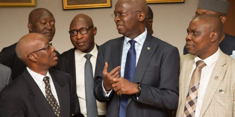 Hon. Minister of Power, Works & Housing, Mr Babatunde Fashola,SAN(3rd right), Chairman, Estate Surveyors and Valuers Registration Board of Nigeria, ESV. Yinka Sonaike(3rd left), Vice Chairman, ESV. Ozili Peter(2nd left), ESV. Bolarinde Patunola Ajayi(2nd right), ESV. Bature Muhammad(right) and others in a group photograph shortly after the inauguration of the Board of Estate Surveyors and Valuers Registration Board of Nigeria (ESVARBON) at the Ministry of Power,Works & Housing Headquarters, Mabushi , Abuja on Tuesday, 30th May 2017.