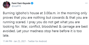 “Burning Igboho’s house at 3.00a.m. in the morning only proves that you are nothing but cowards & that you are running scared. I pray you do not get what you are looking for. War, conflict, bloodshed & carnage are best avoided. Let your madness stop here before it is too late.”