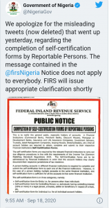 The Federal Government has apologised for its Tweet ordering all account holders in the country to obtain and fill self-certification forms.