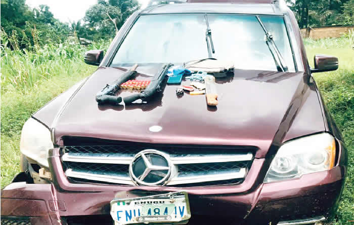 “They found clothing with blood stains in the vehicle as well as two pump action guns and a machete. The vehicle, a wine-coloured Mercedes GLK 350 4matic with number plate ENU484 JV was recovered and deposited for safekeeping at Area Command Headquarters in Uga.”