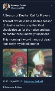 He took to his twitter handle to mourn the sudden exit of his brother,and other deaths which include a pool driver,Toyin Ogunbamwo,killed by a hit and run driver,Late Pastor Ibidun Ighodalo, and Senator Bayo Osinowo.