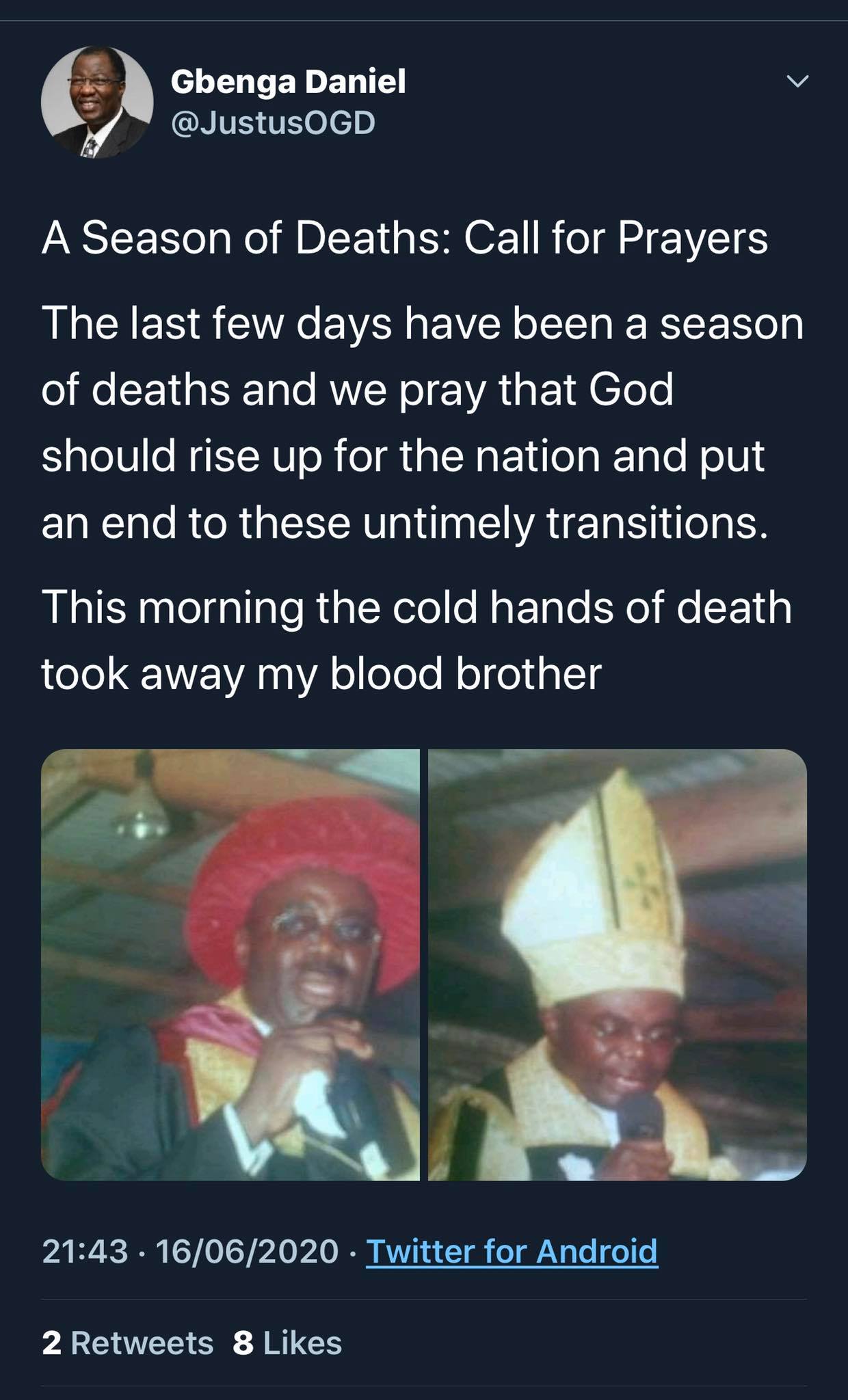 “The season of deaths:call for prayers” were the exact words two time governor of Ogun State,Otunba Gbenga Daniel used to announce the exit of his blood brother, Bishop Simeon Oye Daniel{Aged 56),until his death,he was the Provost,Imperial School Of Health Technology.