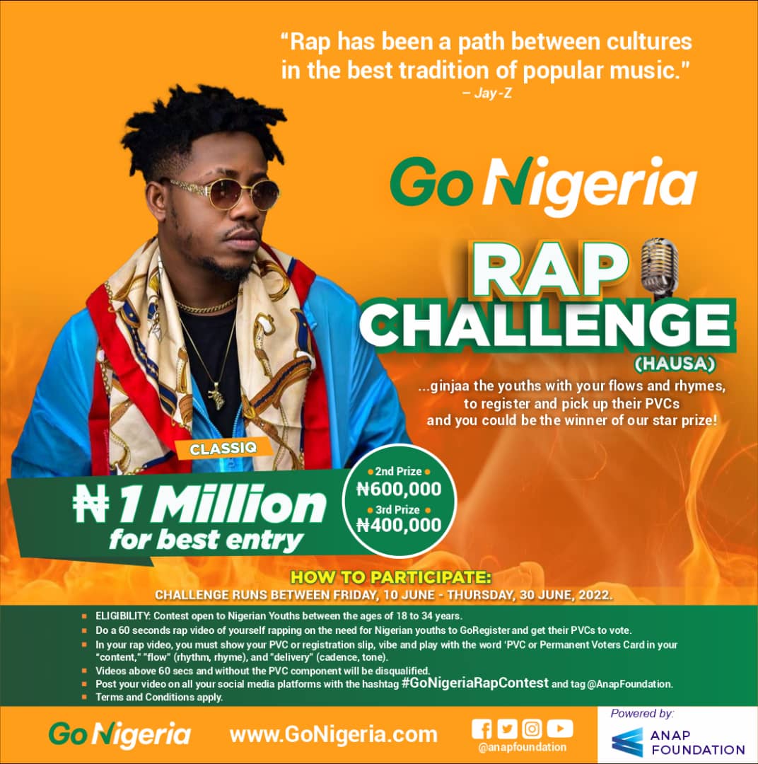 The Hausa Rap Challenge will be anchored by Buba Barnabas Luka (Classiq). This on-line rap contest will run from Friday, 10 June, 2022 to Thursday, 30 June, 2022. Only Nigerian youths between the ages of 18 to 34 years and who have PVCs are eligible to participate. Participants are required to send in a 60 seconds rap video, in which they must show their Permanent Voters Card (PVC) or registration slip and play with the word PVC or Permanent Voters Card in their rap production. The video must adequately communicate the important need for Nigerian youths to GoRegister and get their PVCs before 30 June, 2022. The judges will consider ‘’content originality’’, ‘’flow’’ [rhythm, rhyme], and ‘’delivery’’ [cadence, tone], and potential impact. Contestants must post the video on all their social media platforms with the hashtag #GoNigeriaRapChallenge and tag @AnapFoundation.