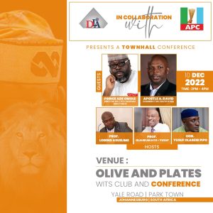 South Africa chapter of the All Progressives Congress, APC, is set to host a Town Hall conference in support of the presidential candidacy of Asiwaju Bola Ahmed Tinubu
