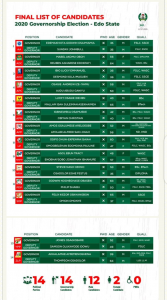 The Independent National Electoral Commission (INEC) has published the final list of candidates for the 2020 Governorship Election in Edo State, Igbere TV reports.