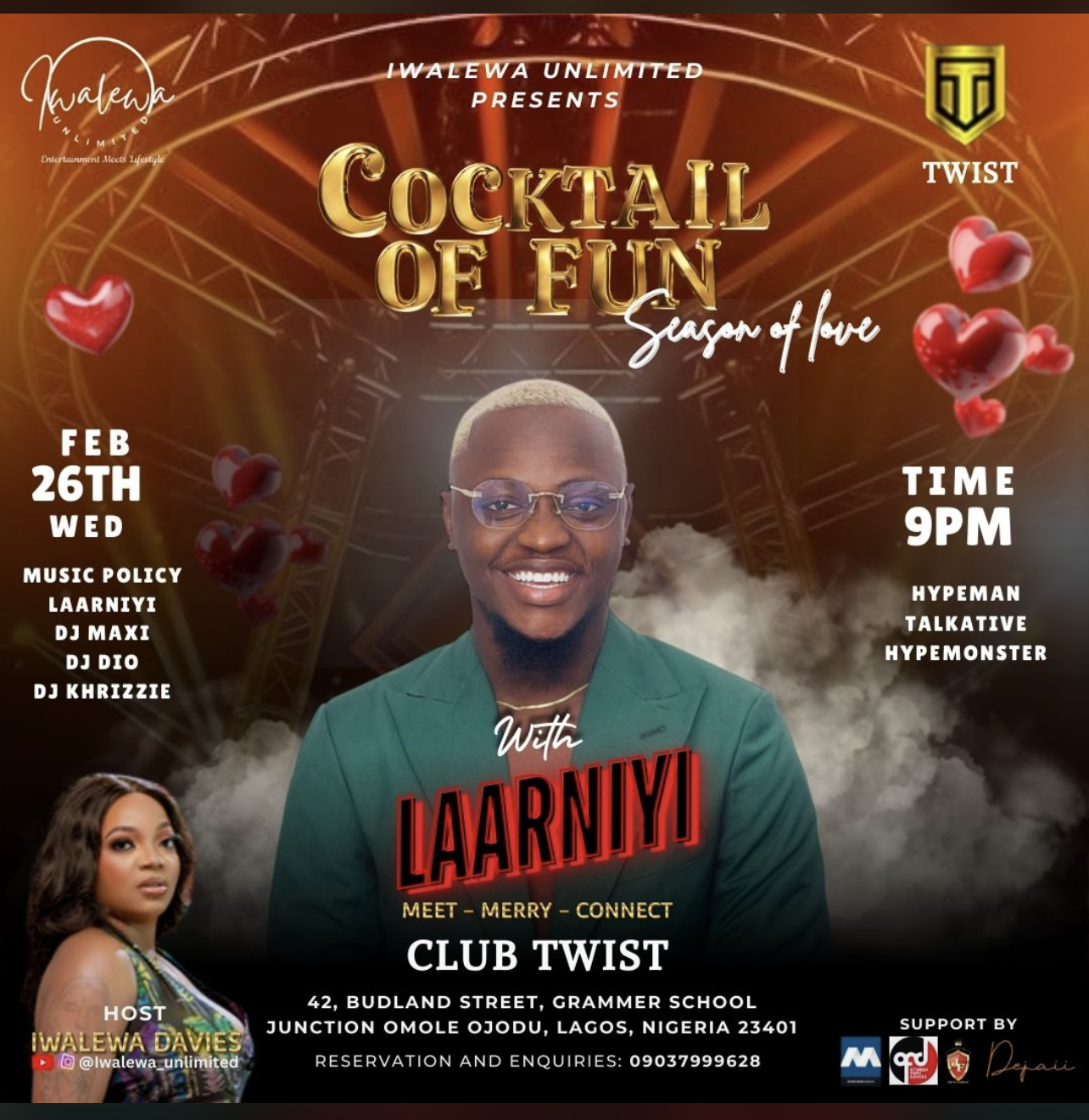On the bandstand for the night is the sensational *Laarniyi*, renowned for his soul-lifting and evergreen melodies. His performance is expected to set the perfect mood, blending love-themed tunes with high-energy entertainment.