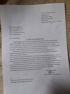 A Senior Special Assistant from Urhonigbe South ward 8, Faith Obasuyi, at the early hours on Friday, tendered her resignation letter from the services of the Edo State government.