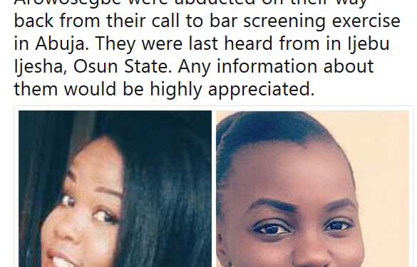 wo Nigerian ladies, identified as Fisayo Adeosun and Ife Arowosegbe have been reportedly kidnapped on their way back from their call to bar screening exercise which took place in Abuja.