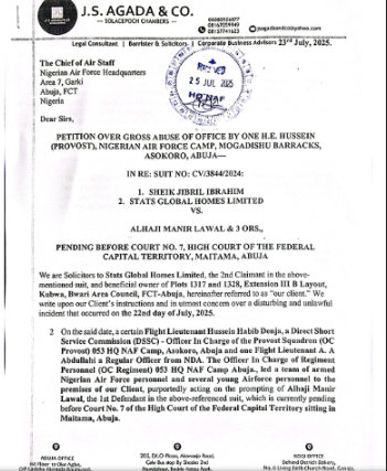 In a petition dated July 25, Agada wrote to the Chief of Air Staff, Air Marshal Hassan Bala Abubakar, demanding a full investigation, disciplinary action, and ₦300 million compensation for the victims.