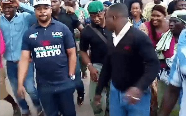 MC Oluomo who was guarded by security operatives – was hailed and praised by the large crowd including street touts and market woman after concluding an All Progressives Congress APC event in the area.