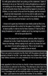 It is with great sadness that I am putting out this statement. I deem it necessary to do so as I feel my life is being threatened as a result of me walking out of my marriage. The purpose of this statement is to let all and sundry know that should anything happen to me and my children it is as a result of my exit from the palace, and the monarch should be held responsible. It is not my wish to walk out of my marriage without reason, I can not continue to live under bondage as I wish to live and be the best I can for my children.