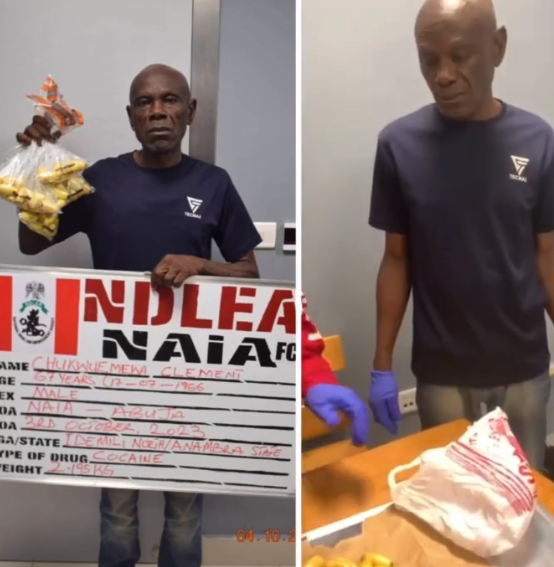 Operatives of the National Drug Law Enforcement Agency, NDLEA, have arrested a 67-year-old trafficker, Chukwuemeka Clement, at the Nnamdi Azikiwe International Airport, NAIA, Abuja for ingesting 100 wraps of cocaine.