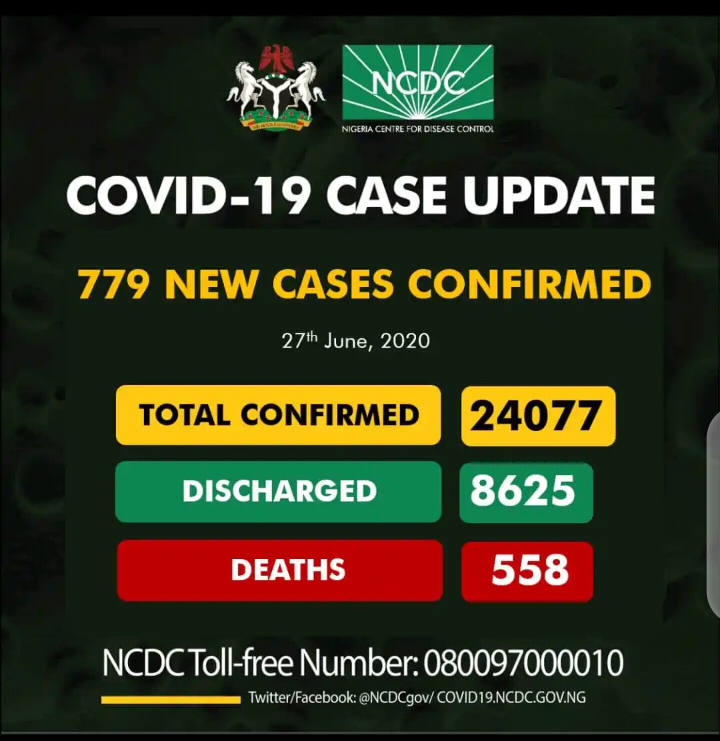 Nigeria has recorded 779 new cases of coronavirus, bringing the total number of confirmed infections in the country to 24 ,077. Lagos – 285 , Rivers – 68 , FCT – 60, Edo – 60 , Enugu – 56 , Delta – 47 , Ebonyi – 42, Oyo – 41, Kaduna – 19, Ogun – 18, Ondo – 16 , Imo – 12, Sokoto – 11, Borno – 9, Nasarawa -8, Abia – 5, Gombe – 5 , Kebbi – 5 , Kano – 4, Yobe – 3, Ekiti – 3 , Osun -2.”