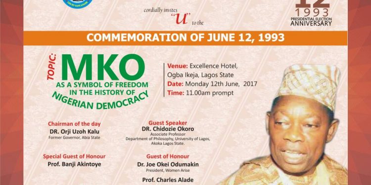 The event put together by Odua People’s Congress led by Otunba Gani Adams,will be chaired by the former Governor of Abia State Dr. Orji Uzoh Kalu. Guest Speaker is Dr.Chiedozie Okoro, Associate Professor, Dept. of Philosophy,University of Lagos, specialist in Applied Ontology, African Metaphysics and Development Issues.He will dwell on the topic “MKO as a Symbol of Freedom in the History of Nigeria Democracy”.