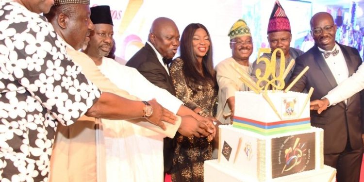 Lagos State Governor, Mr. Akinwunmi Ambode (3rd left), former Deputy Governor of Lagos State, Alhaja Sinatu Ojikutu (2nd left); President, Dangote Group, Alhaji Aliko Dangote (left); wife of the Governor, Mrs. Bolanle Ambode (2nd right) and other guests during the Lagos @ 50 Gala Night at the Lagos House, Ikeja.