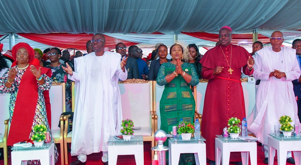L-R: First Lady of Lagos State, Dr (Mrs) Ibijoke Sanwo-Olu; Governor Babajide Sanwo-Olu; wife of the Deputy Governor, Mrs Oluremi Hamzat; Chairman, Christian Association of Nigeria (CAN) Lagos chapter, Revd Stephen Adegbite and the Chairman of APC Lagos, Hon Cornelius Ojelabi, during the State’s Christmas Carol of Nine Lessons Service at the Lagos House, Alausa, Ikeja, on Thursday evening, December 15, 2022.