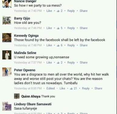 For some odd reason Mc Donald Ochieng felt it would be a great thing to share a conversation he had with the hurt lady but he received the bashing of his life from the public the second he dropped the photos on Facebook and wrote: