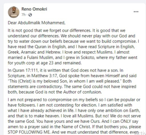 Quoting from the Bible and the Quran, Omokri said it was clear that both faiths serve different God.
