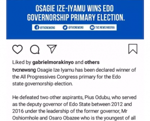 Governorship Candidate Osagie Ize-Iyanmu has been declared winner of the All Progressives Congress Primary Election for the Edo State Governorship Election, after defeating all the contenders like Pius Odubu (a one-time deputy governor of the Edo State under the administration of former Governor Adams Oshiomhole) and Osaro Obaeze (the youngest amongst all the aspirants), all among the others like Godwin Obaseki and three others who were disqualified before the screening.