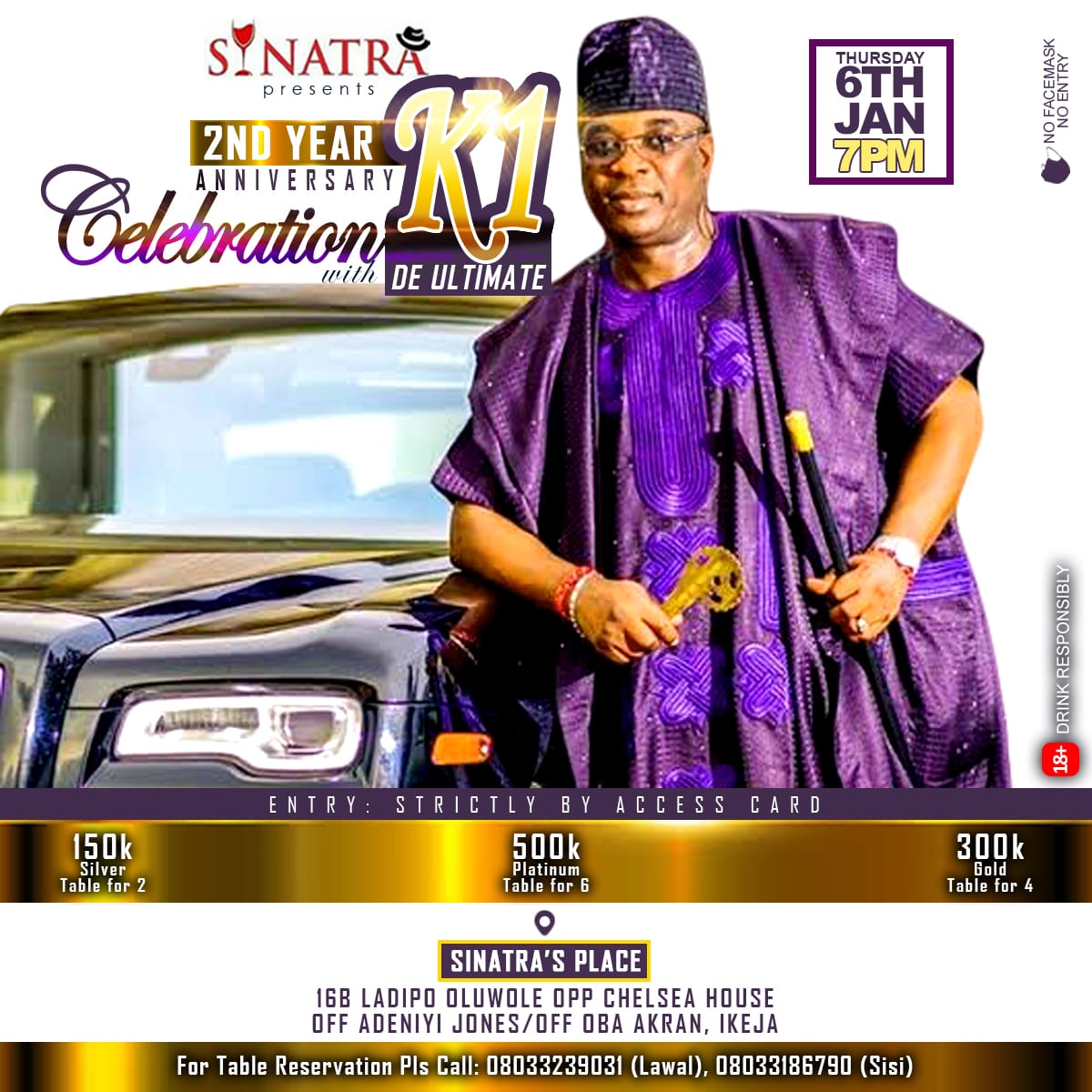 Leading mainland hospitality and entertainment outfit, Sinatra’s Place is set to celebrate its second year as a brand and based on feelers all over social media, leading entertainers like Mayegun of Yorubaland, K1 De Ultimate; songsters Ludare and Mr Solek have been confirmed as those who would create the feel-good atmosphere Sinatra patrons are accustomed.