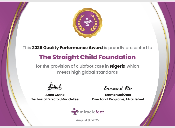 Straight Child Foundation (TSCF), a non-governmental organisation based in Umuahia, Abia State, has received the prestigious 2025 Quality Performance Award from MiracleFeet, a leading global charity focused on ending clubfoot disability.