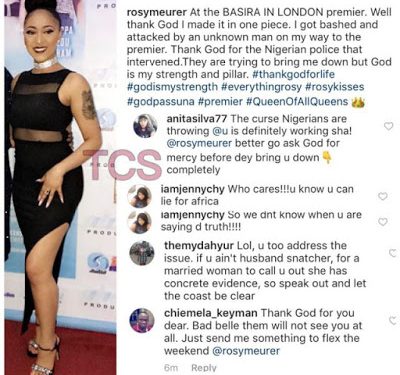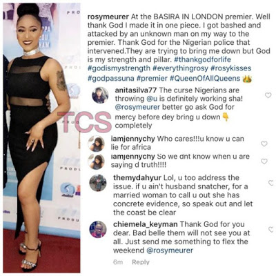 Alleged Home breaker, Rosaline Meurer has just revealed that she was attacked yesterday in Lagos by an unknown man on her way to a movie premiere.