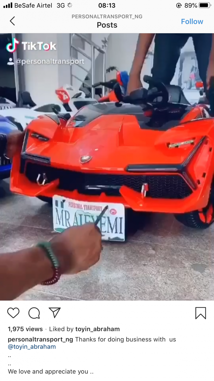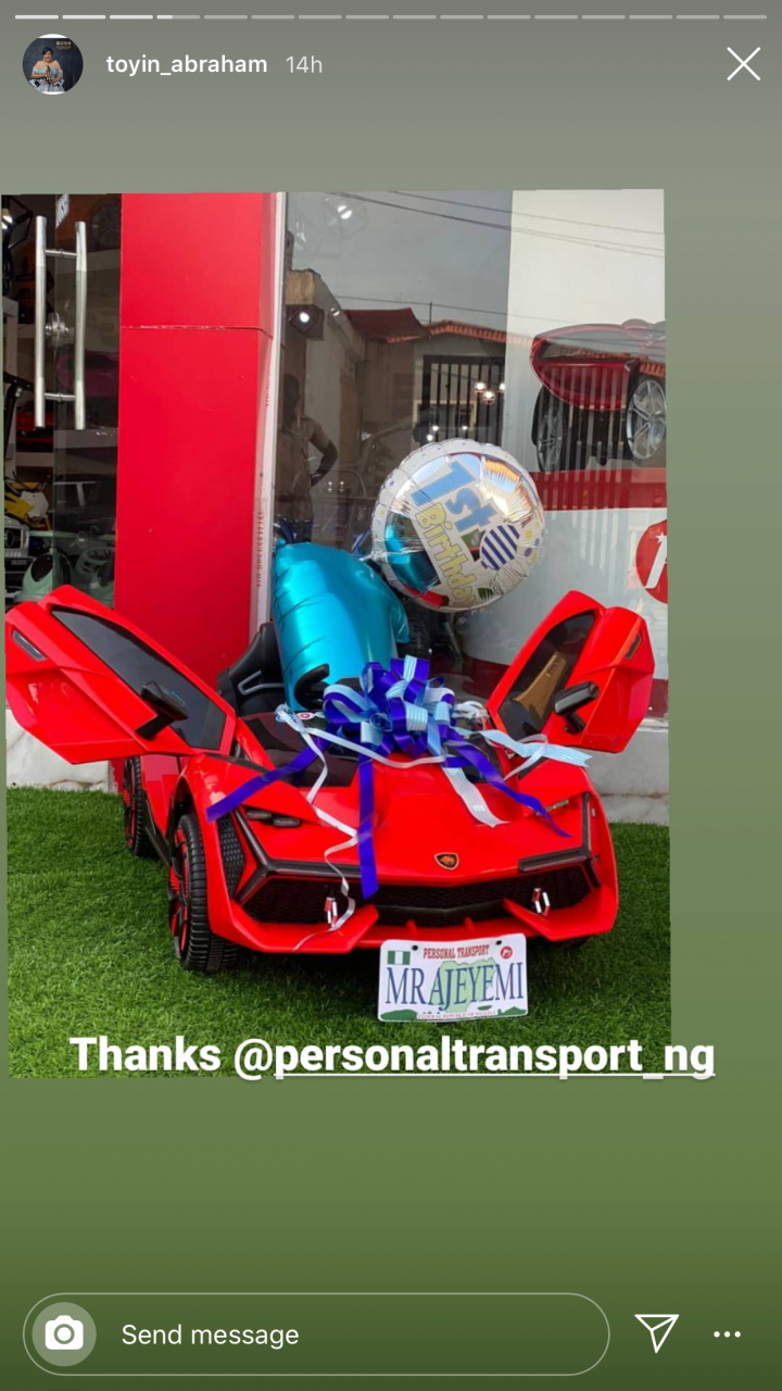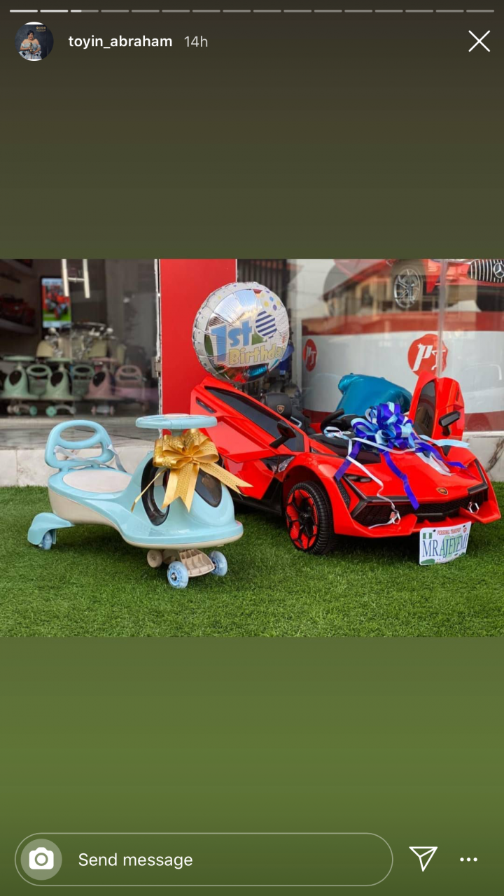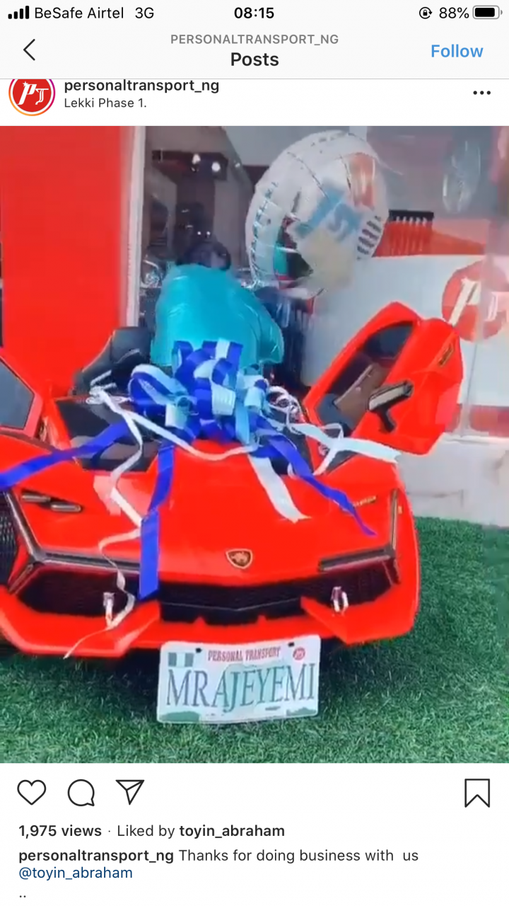 Toyin got Ire a Lamborghini mini car and a swing car with a custom plate number ‘Mr. And Ajeyemi.’ This is coming months after she got him a jeep.
