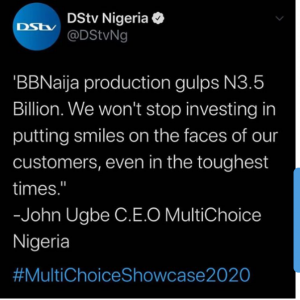 In the tweet, DSTV mentioned that the production of the reality show took a sum of 3.5 billion from them. According to the CEO of Multichoice, John Ugbe, DSTV Nigeria won’t stop investing on shows that would put smiles on their customers faces.