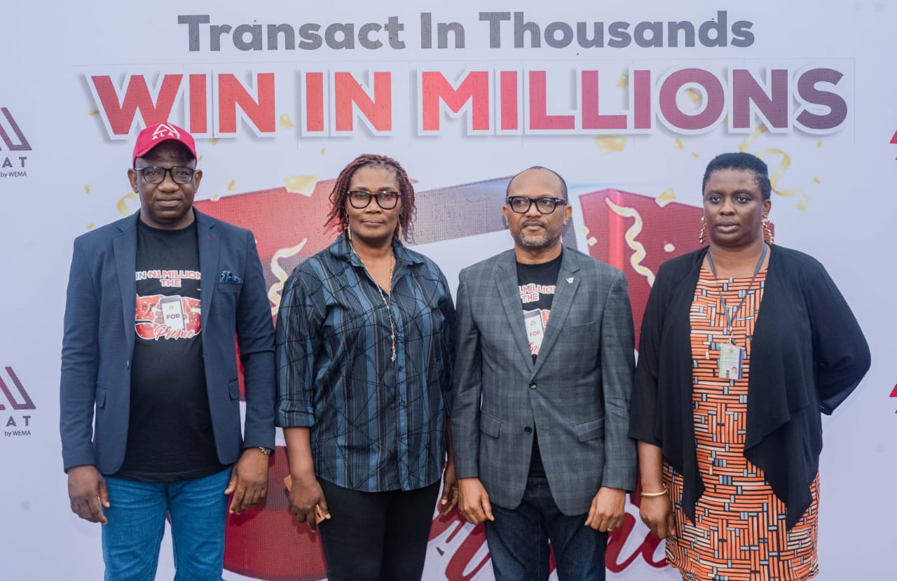 Left to Right: Mr. Olukayode Adebayo, RCH Ikeja 1 Zone, Wema Bank Plc; Mrs. Susan Onwuka, Representative of FCCPC; Mr. Dotun Ifebogun, Divisional Head, Retail and SME Business, Wema Bank Plc; and Ini Ibok, Representative of National Lottery Regulatory Commission at the Wema Bank 5for5 Promo draws which took place in Lagos